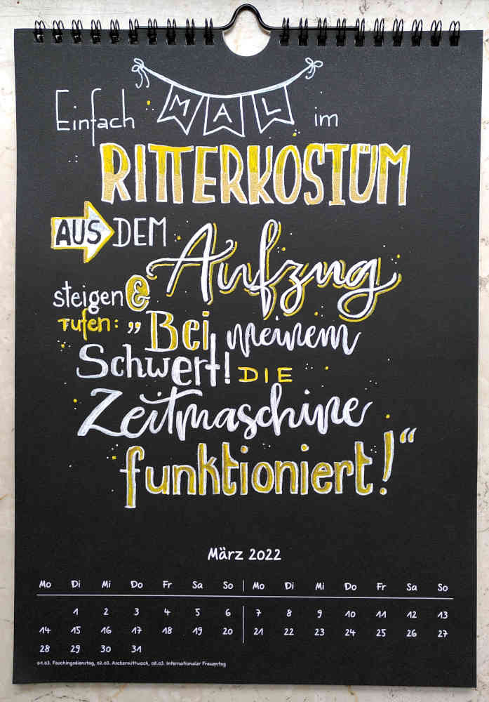 Diesen Kalender habe ich speziell für 2022 entworfen. Als „Grundgerüst“ diente mir ein gewöhnlicher Bastel-/ und Fotokalender von dm. Besonders das Arbeiten auf einem dunklen Hintergrund war neu für mich und ich musste erst einmal passende Stifte auswählen und testen, mit denen das Lettern störungsfrei ablaufen konnte.